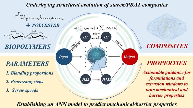 近日,食品科学与工程学院侯汉学教授团队在ACS Sustainable Chemistry Engineering发表了题为“Regulation of Mechanical and Barrier Properties of Starch/PBAT Films from Extrusion Perspective: Structural Evolution, Correlation Insights and Predictive Model Development”的研究论文。淀粉/聚对苯二甲酸-己二酸丁二醇酯(PBAT)复合材料是一种有前途的可生物降解材料,可用作食品、农业等多行业的可持续膜材。然而,双相体系的成膜过程较为复杂,难以系统地解析淀粉与PBAT在混合加工过程中所经历的分子结构、结晶结构及相结构转变。此外,大多数研究受限于样本数量较少,缺乏在加工参数与薄膜性能之间建立稳健的关联、预测模型。图1 围绕ANN模型解析、预测全降解包装膜结构和性能的研究思路为此,本研究构建了一个仅包含淀粉、甘油与PBAT的简化体系,以系统研究淀粉/PBAT复合材料在挤出成膜过程中的结构演变。在