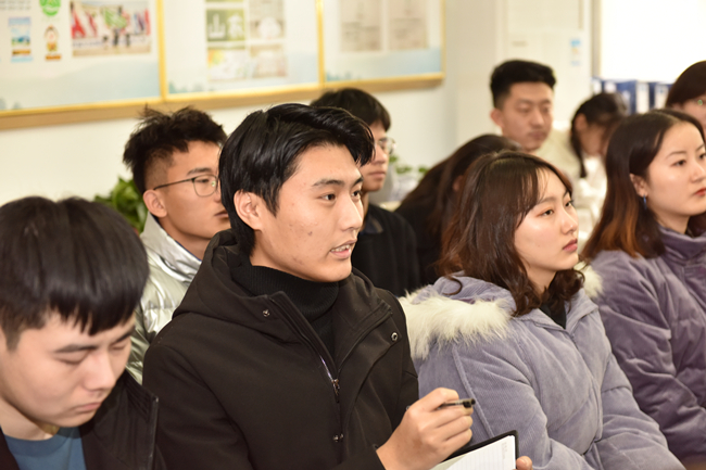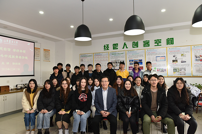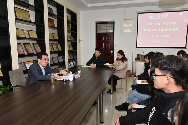 隆冬时节,寒风凛冽。经管学院(商学院)创新创业中心教室里暖意融融,气氛热烈融洽。授课开始前,班长赵海龙、团支书童彤任等几位同学向班主任汇报了班级和同学们近来发展情况。听到班级学习成绩在专业排名中稳步提升,同学们在不同领域取得了新的成绩,徐剑波非常高兴。他说,山东农业大学是一片成才沃土,不久前,我们又有1位校友当选中国工程院院士,这也是学校走出的第10位两院院士。只要大家明确了发展方向,付出了辛勤努力,打牢了知识根基,就一定能像这些优秀校友一样,在不同的岗位上发光发热、成长成才。