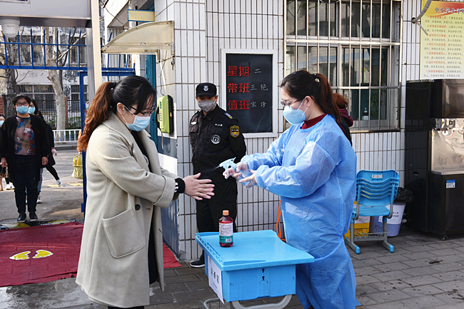 本次实战演练主要模拟在带班领导和值班教师提前到岗、师生入校、课上突发情况、校园活动、错时放学、校内全面消杀等场景中,如何做好体温检测、日常消毒、口罩破损更换等工作,尤其演练了遇到课堂上发现学生有咳嗽、体温异常等症状的情况时,迅速按照规定上报、隔离、消毒、停课等应急处置工作的全过程。
