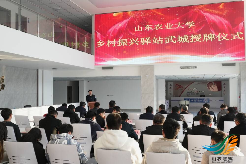 山农融媒1月31日讯 1月28日,山东农业大学在武城县举行乡村振兴驿站挂牌仪式。学校党委副书记、校长冷畅俭参加活动,并为乡村振兴驿站授牌。武城县委书记朱恩鹤出席仪式并致辞。