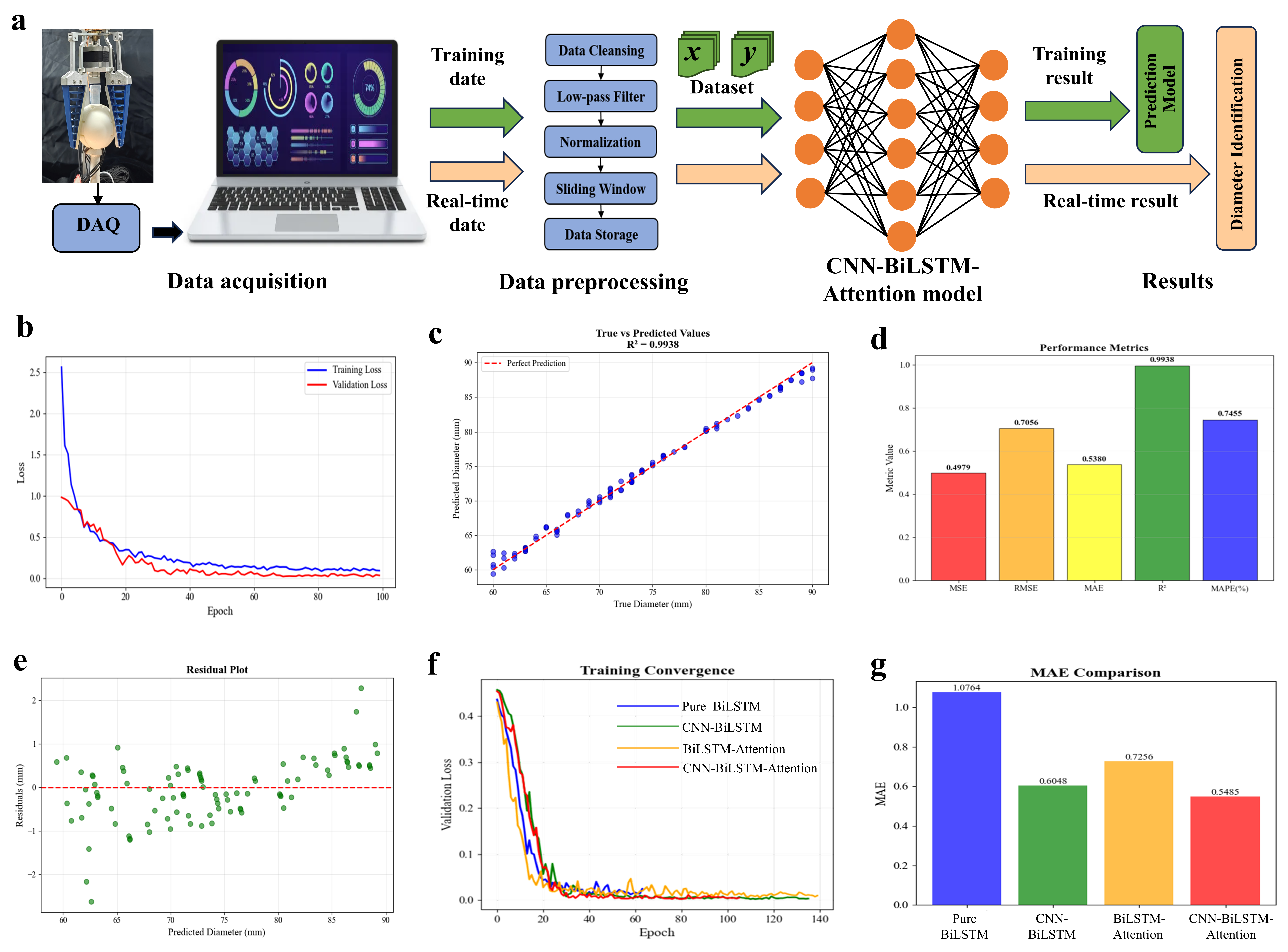 针对以上技术难题,研究团队提出了一种融合柔性力感知与深度学习的苹果果径实时检测与分级新方案,实现了采摘与尺寸分级的同步一体化作业。研究团队将自主研制的离子凝胶摩擦纳米发电机(IG-TENG)部署于三指Fin-Ray柔性末端执行器。该系统能够实时、灵敏地采集末端执行器与苹果的力时序数据。为实现尺寸的精准预测,团队构建了一种新型的CNN-BiLSTM-Attention混合深度学习网络。该模型能够实时融合抓取过程中的力感知时序数据、电机的行程数据和果实位姿信息。通过CNN提取局部特征,BiLSTM捕捉长时序依赖,Attention机制聚焦关键时间步,模型可以拟合不同抓取条件与果实几何尺寸之间的复杂映射关系。田间试验结果表明,该果径预测方法与人工测量值相比,平均绝对误差(MAE)仅为2.13 mm,尺寸分级正确率高达92 %。这一研究为智能采摘装备的无损作业和精准分拣提供了高效、低成本且可靠性强的新技术路径。