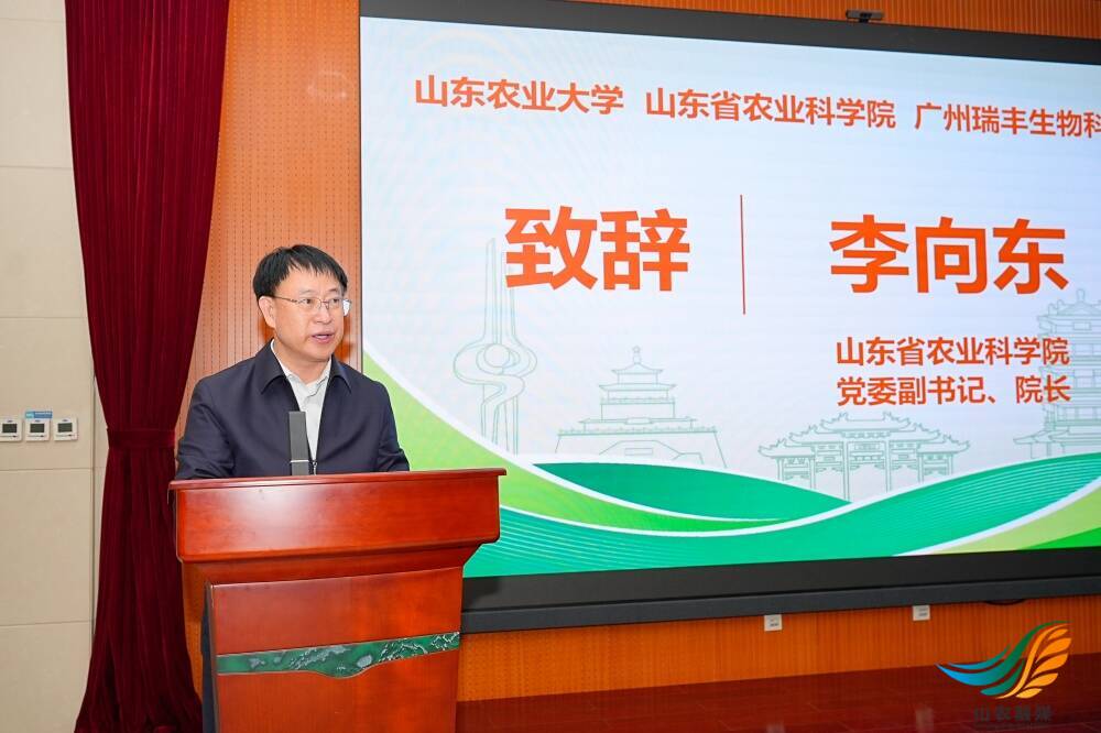 冷畅俭代表山东农业大学向长期以来关心支持学校发展的领导专家表示衷心感谢,并简要介绍了学校发展历史和近期办学治校取得的成绩。他表示,山东农业大学、广州瑞丰生物科技有限公司与山东省农科院各具特色、各有优势,三方签署合作协议是优势互补、资源共享的必然选择,也是共担使命、共创未来的崭新起点,山东农大将以最大诚意、最优资源、最实举措,全力推动合作协议落地见效,期待通过合作,共同突破一批关键核心技术,推动一批重大成果转化,培育一批高水平产业人才,携手打造院校企协同创新的示范标杆,为保障国家粮食安全、建设更高水平“齐鲁粮仓”作出新的更大贡献。