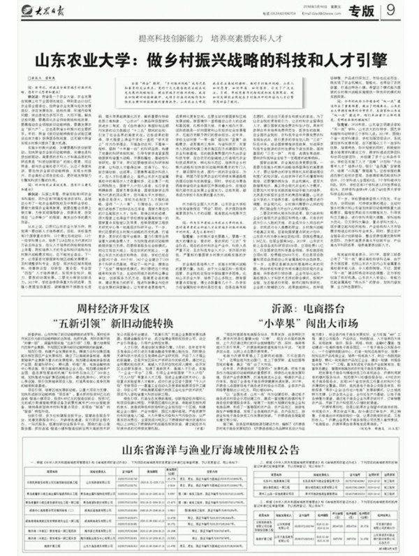 3月16日,大众日报以《山东农业大学:做乡村振兴战略的科技和人才引擎》为题,用超过4000字的篇幅为山东农业大学发声。文章中,学校党委书记徐剑波、校长张宪省分别问答了记者的提问,围绕农业高校在实施乡村振兴战略、加快新旧动能转换中的作用发挥,培养高素质农科人才,推进“双一流”建设等,畅谈了各自观点和意见建议。