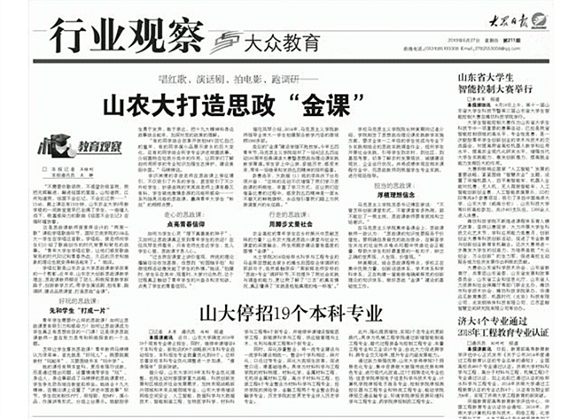 6月27日,《大众日报》以“山农大打造思政金课”为题刊发通讯报道,详细介绍山东农业大学创新教育教学模式,打造好玩、走心、行走、担当的思政课程、思政课堂,引导学生用脚步丈量社会,在读书和实践中点亮青春信仰、厚植理想信念的典型做法。文章2000余字,是学校思政课教学的生动写实。