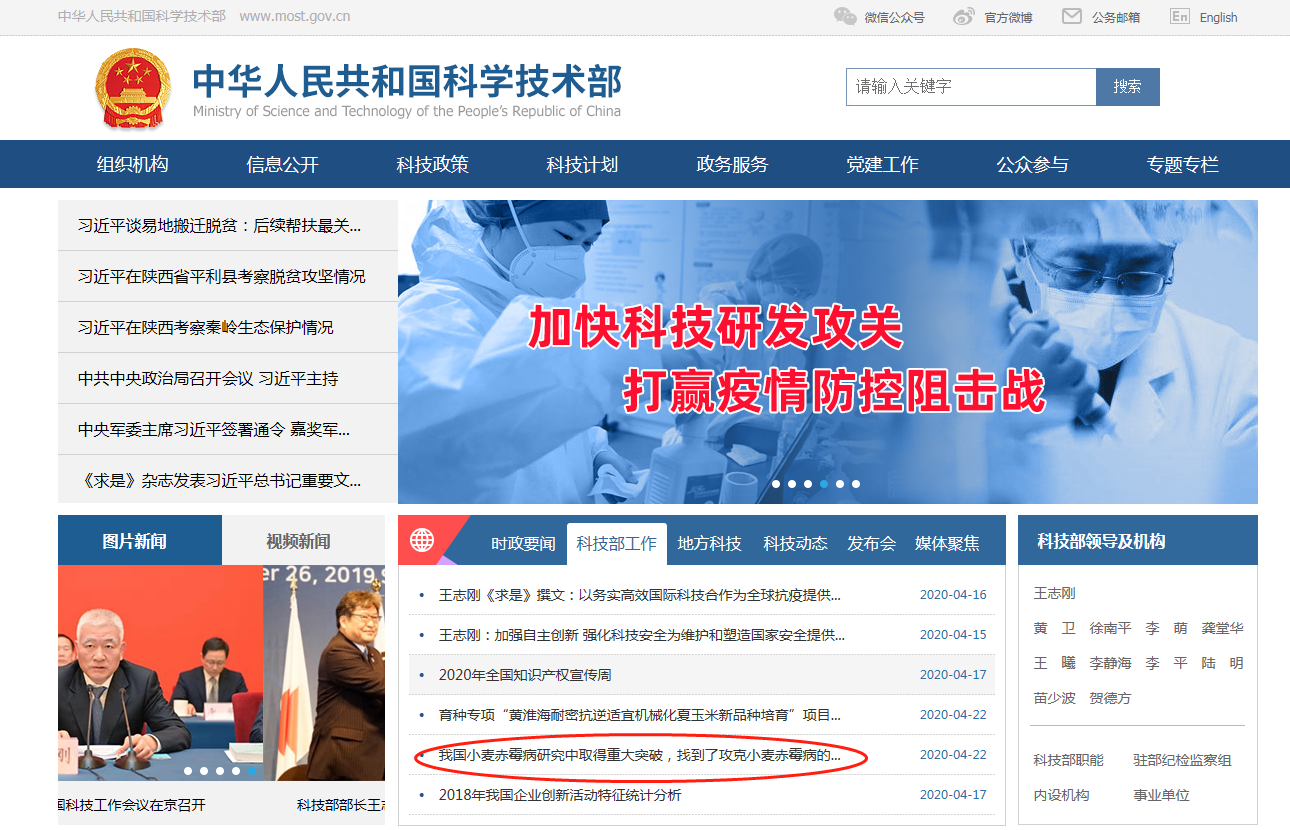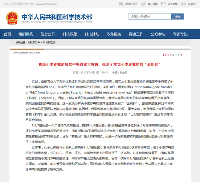 4月22日,中华人民共和国科技部网站在主页重要位置以《我国小麦赤霉病研究中取得重大突破,找到了攻克小麦赤霉病的“金钥匙”》为题发布消息,介绍我校孔令让团队近期重大科技成果。