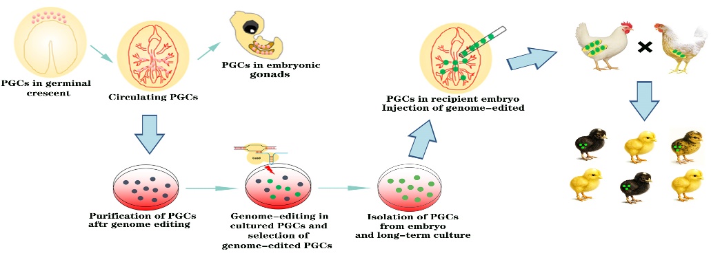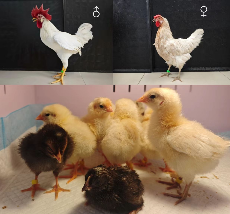 原始生殖细胞是精子和卵子的前体细胞,在禽类基因编辑和种质资源保存中具有重要意义。近日,山东农业大学动物科技学院朱桂玉教授团队成功利用地方鸡生殖细胞制备了基因编辑鸡。课题组将基因编辑的芦花鸡原始生殖细胞移植入京粉1号鸡胚胎血管内,这些细胞迁移至性腺形成生殖嵌合体鸡。性成熟后,嵌合体京粉鸡之间进行配种,成功繁殖出头部白斑且绒毛为黑色的芦花鸡后代,进而高效筛选出了基因编辑阳性鸡。此研究为地方鸡的保种奠定了基础,利用原始生殖细胞可以实现禽类品种的长期保存和复活;另外,先通过毛色初步筛选,再进行基因判型,可有效降低基因编辑鸡的筛选难度和成本,显著提高筛选效率。成果在《Stem Cell Research & Therapy》期刊发表。