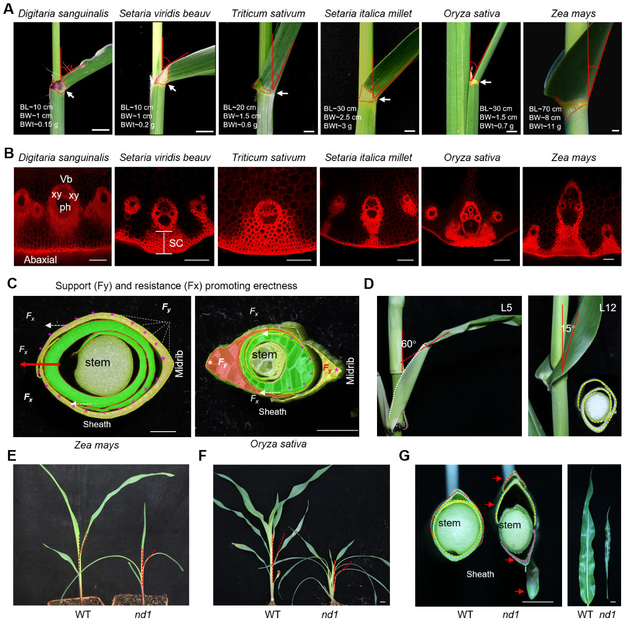 在本研究中,团队通过对玉米、水稻、小麦等多种植物的叶片结构进行细胞学比较分析,创新性地提出叶片角度并非由单一因素决定,而是“支撑力”与“下拉力”动态平衡的结果。其中,“下拉力”主要来源于叶片自身的重力。相较于水稻、小麦等其他禾本科物种,玉米的叶片更长、更宽和更重,因此由自重引起的下垂趋势也更为显著。“支撑力”则是作物对抗叶片下垂的反作用力,主要取决于三个关键因素,包括叶鞘包裹茎秆的紧实度、层数和高度;叶枕(叶片与叶鞘连接处)区域的木质化程度、以及主叶脉的韧性和长度。研究发现,玉米之所以能在拥有硕大叶片的同时,依然保持相对较小叶夹角和直立的姿态,关键在于其演化出强大的机械支撑强度。与水稻、小麦相比,玉米叶鞘包裹茎秆层数多且紧实,叶枕区域沉积了更多的木质素,并且形成了厚实的厚壁组织。这些结构如同内置的“钢筋骨架”,为叶片提供了强大的力学支撑,有效抵抗了叶片重量带来的下拉力,从而维持叶片的直立生长姿态。进一步,研究团队通过降低玉米叶鞘对茎秆的包裹层数和紧实度(nd1),打破支撑和下拉力间的动态平衡,导致玉米叶夹角显著增加并引起叶片下垂,证实了以上理论的真实性(图1)。