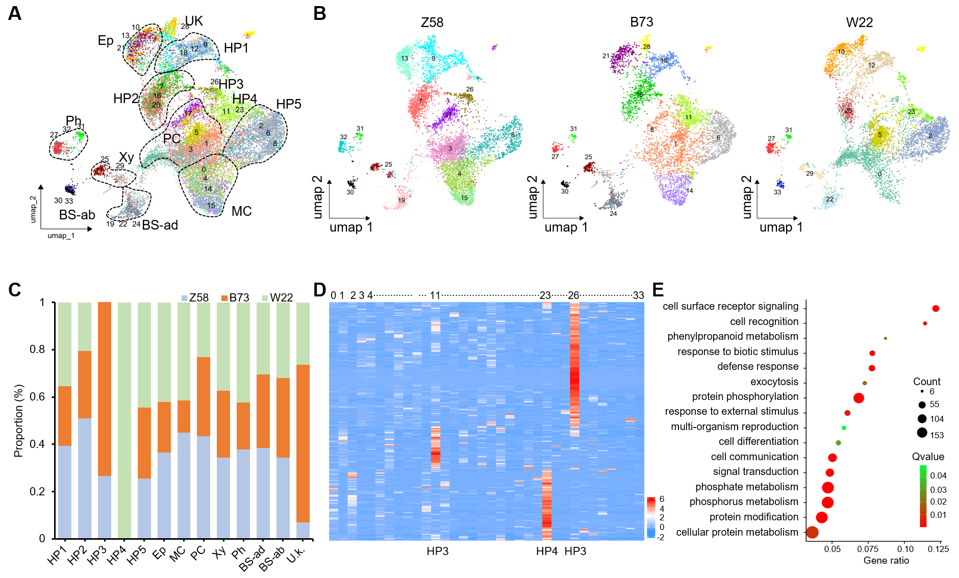 为从细胞层面解析不同株型自交系机械支撑能力差异的分子基础,研究团队对Z58(紧凑型)、B73(中间型)和W22(平展型)三个玉米自交系的叶枕区域进行了单细胞核转录组测序,成功构建了包含18,427个细胞核、34个细胞簇的高分辨率叶枕区细胞图谱。通过跨品系比较分析,发现HP3细胞亚群(近轴侧皮下细胞)仅在Z58和B73中存在,且木质素合成代谢通路相关基因特异性富集。这一分子层面的特征与Z58近轴侧木质素沉积的组织学观察高度吻合,从单细胞分辨率层面揭示了紧凑型品种近轴侧木质素沉积的细胞基础(图3)。
