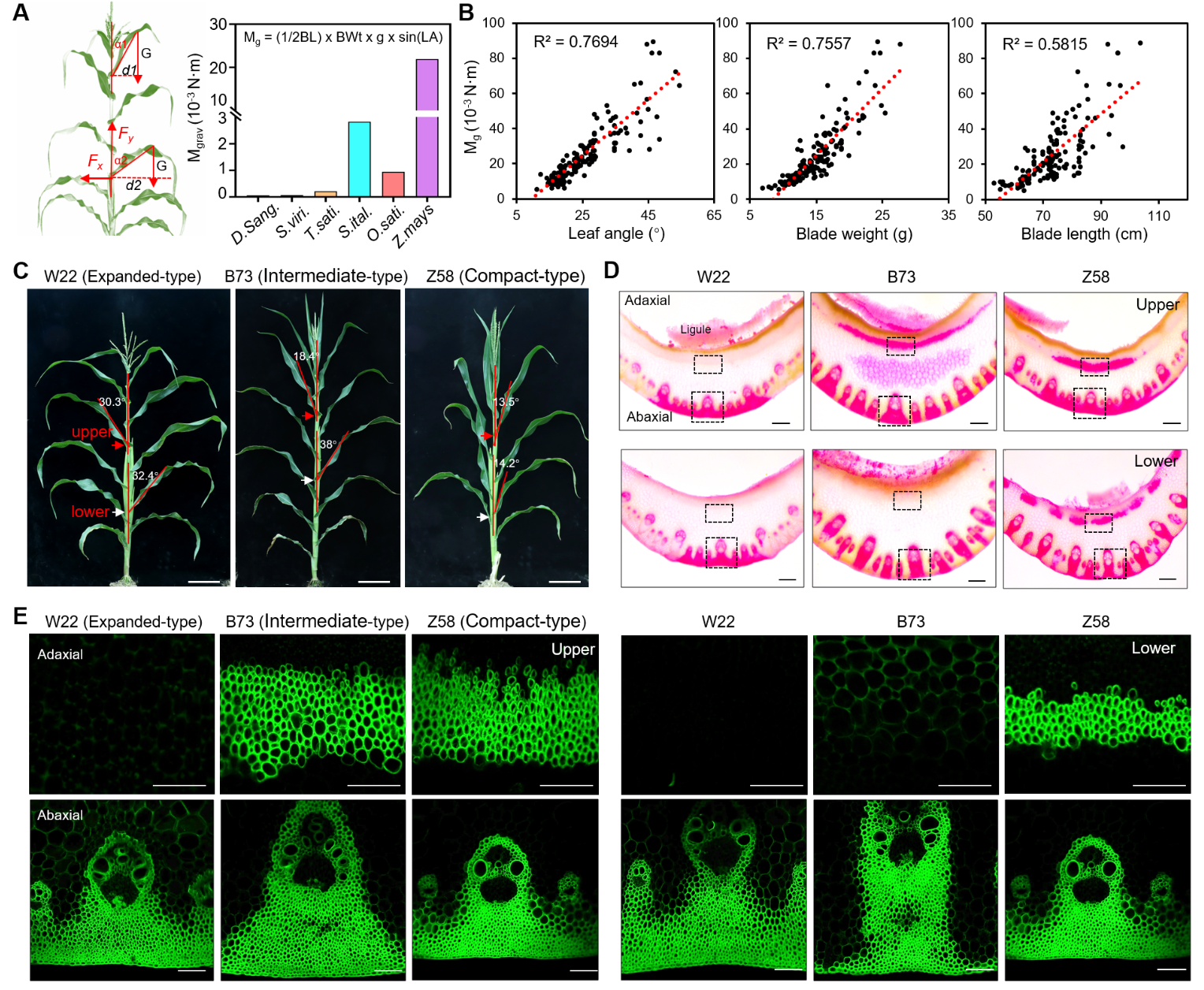 自然状态下,植物叶片的机械支撑力和下拉力处于平衡状态。为系统评估这两种力,研究团队首次将物理学中的“力矩”概念引入植物形态分析,基于叶片质量分布和几何形态的合理简化构建了计算公式:M = 1/2BL × BWt × g × sin(LA)。通过对147份玉米自交系的生理指标测定和分析,发现力矩主要由叶长、叶重及叶夹角共同决定,并与这些参数正相关。具体而言,叶夹角越大的自交系,其力矩越大,表明维持叶片平衡所需的机械支撑力越强;反之,叶夹角较小的紧凑型自交系力矩较小,对机械支撑的需求也相应减弱。
