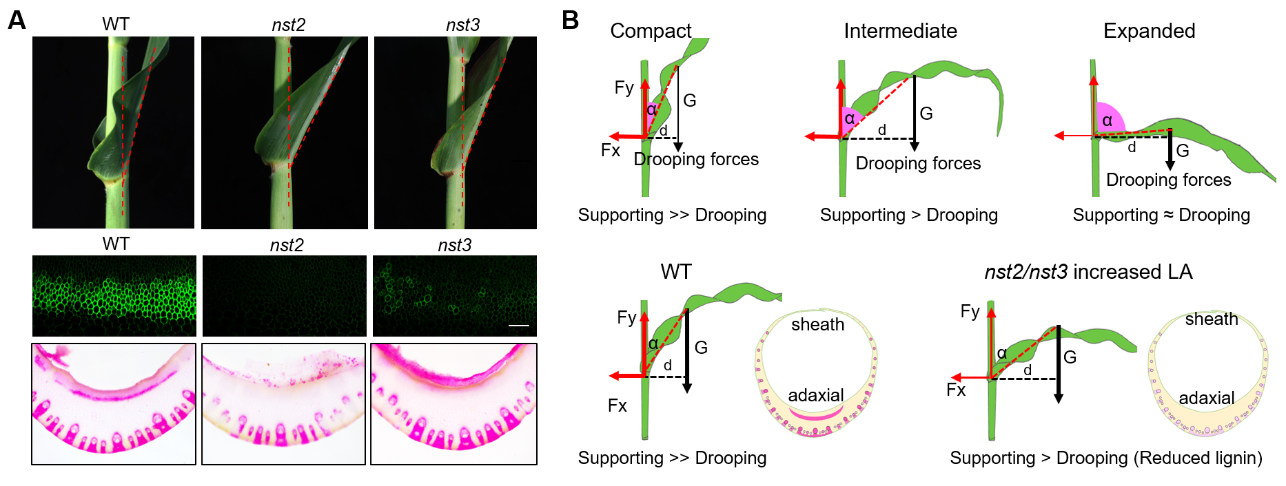 基于对三个自交系叶枕近轴侧与远轴侧转录组的比较分析,筛选出参与木质素合成调控的关键转录因子—MYB和NAC家族成员。在平展型自交系W22中,这两类转录因子家族基因在远轴侧的表达量显著高于近轴侧;而在紧凑型Z58和中间型B73中,其表达水平在两侧并无显著差异。这一表达模式与三个自交系在近轴侧木质素沉积上的差异高度吻合,提示这些转录因子可能参与调控近轴侧特异性木质素合成。为进一步验证候选基因的功能,研究选取NAC转录因子家族中的NST2和NST3进行深入分析。RNA原位杂交结果显示,NST2和NST3的转录本主要定位于维管束鞘、厚壁组织及叶枕近轴侧皮下细胞,其空间分布与木质素沉积位点高度一致。功能验证表明,相较于野生型,nst2和nst3突变体的叶夹角增大,叶枕近轴侧木质素沉积完全缺失,叶片最大支撑力显著下降。综合上述结果,NST2和NST3通过特异性调控叶枕近轴侧木质素生物合成,正向调节叶片的机械支撑能力,从而减小叶夹角(图4)。