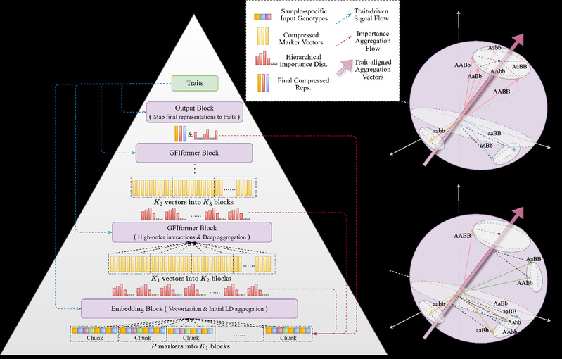 • 近日,机械电子工程学院刘平教授、生命科学学院李祥教授联合中国农业科学院果树研究所王海波研究员在《Plant Biotechnology Journal》上发表了题为“DNAwhisper: An Integrated Deep Learning Pyramidal Framework for Multi-Trait Genomic Prediction and Adaptive Marker Prioritisation”的研究论文,提出了可解释的深度学习全基因组选择计算方法,助力作物复杂表型的早期预测和复杂数量性状遗传效应挖掘。机电学院博士后马岳鑫为第一作者,刘平教授、李祥教授和王海波研究员为共同通讯作者。图1. DNAwhisper模型的金字塔结构示意图现有全基因组选择(genomic selection,GS)方法多以加性模型为主,上位性等非加性效应的建模能力相对不足,对复杂数量性状的遗传贡献刻画不够充分。深度模型虽然具备更强的非线性表达能力,但在多特征小样本条件下训练与泛化容易受限,难以支撑育种决策与生物学验证。团队创新性的提出一种金字塔式可解释育种工具(DNAwhisper模