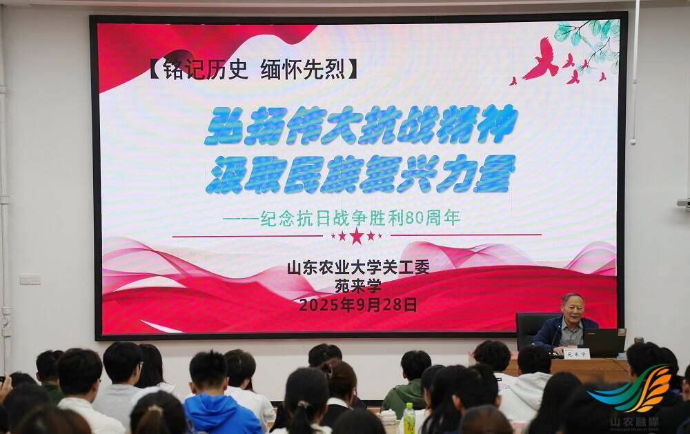 苑来学以“弘扬伟大抗战精神,汲取民族力量”为主题,以“9·3”阅兵为切入点,为青年学生上了一堂生动的思政教育课。他围绕“回顾中华民族抗战历程”“伟大抗战精神的丰富内涵”“波澜壮阔的抗日战争铸就了伟大的抗战精神”“伟大抗战精神的重大时代价值”“汲取民族复兴的强大力量”等方面,带领青年学生回顾了中华民族十四年浴血抗战的革命历程,着重强调了伟大抗战精神在当今时代的重要价值,用三个“更好”激励新时代农大青年要铭记历史,弘扬伟大抗战精神,脚踏实地、艰苦奋斗,在奋进中践行时代使命,为建设一流农业大学、推进农业农村现代化、助力国家乡村振兴战略贡献青春力量。