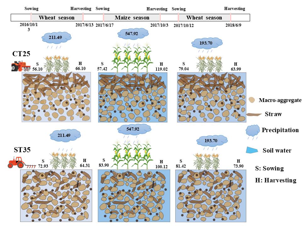 华北平原是我国重要的粮食产区,以小麦-玉米一年两熟为主的种植模式易受季节性降雨不均的限制,导致作物产量具有很大的不稳定性。该研究基于不同深松深度试验,系统比较了不同深松深度对土壤结构与土壤水分利用的影响。结果表明,深松能够有效打破长期翻耕形成的犁底层,显著改善土壤结构,增强土壤水分入渗与蓄水能力。研究进一步发现,深松在玉米收获期维持了显著高于传统翻耕的土壤储水量,并将水分优势成功延伸至后续小麦的播种期,为冬小麦提供了良好的底墒条件,有效缓解了降水与作物需水的错位矛盾,实现了水分的跨季节高效利用。在实现周年水分高效利用的同时,深松显著提高了小麦-玉米作物系统的水分生产力,实现水分高效利用与作物增产的协同提升。