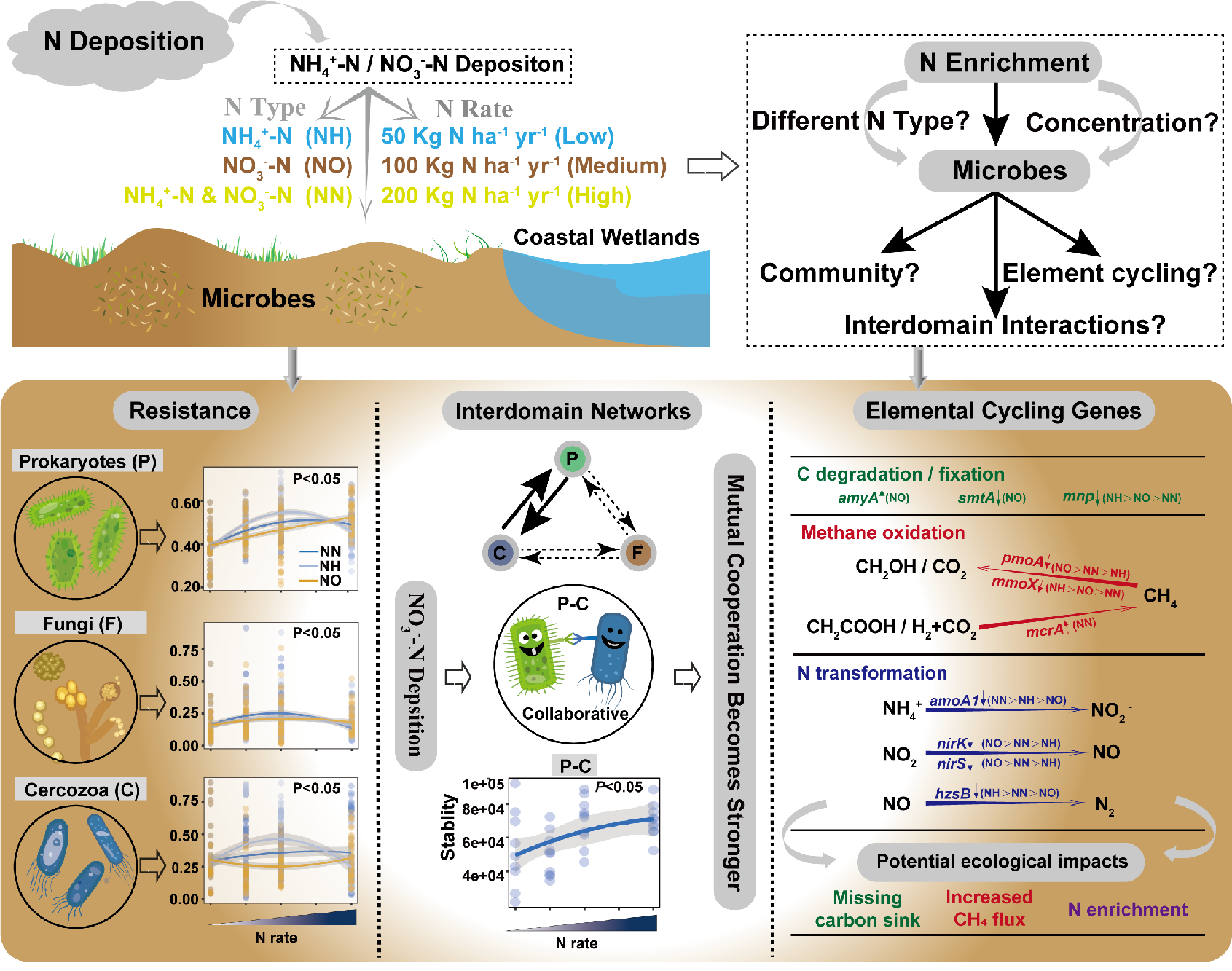 滨海湿地是维系全球生态平衡的关键生态系统,正日益受到多重环境变化的严峻挑战,大气氮沉降加剧作为全球变化的核心特征之一,其对湿地土壤微生物群落及生态功能的影响机制仍存在诸多不确定性。黄河三角洲滨海湿地生态价值突出,其生态保护与修复是我国生态文明建设与黄河流域生态保护和高质量发展重大国家战略的重要内容,然而针对该区域多营养级土壤微生物群落在不同氮沉降环境下的响应模式与功能演化规律,目前仍缺乏系统性认知。