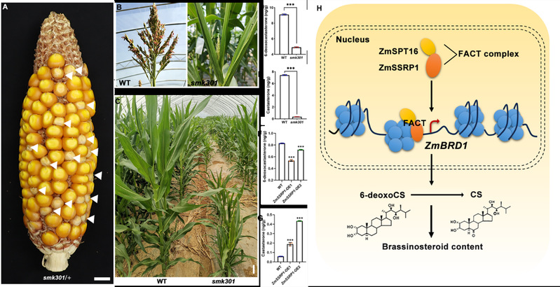 • 近日,《Plant Physiology》杂志在线发表山东农业大学生命科学学院赵翔宇教授、周超副教授课题组的研究论文,题为“ZmSSRP1-mediated chromatin Accessibility Modulates Maize Development via Regulation of ZmBRD1 Transcription”。该研究综合运用图位克隆、多组学联合分析及分子生化验证,揭示了FACT复合体亚基ZmSSRP1通过介导染色质开放状态动态变化,调控油菜素内酯(Brassinosteroid, BR)合成关键基因ZmBRD1的转录水平,进而改变玉米内源BR活性物质含量,最终协同调控籽粒发育与株型建成的分子机制。该成果为玉米高产耐密分子育种提供了重要理论依据与优异基因资源。图1 ZmSSRP1调控玉米籽粒及株型发育的分子机制模型染色质动态调控是真核生物基因表达调控的核心环节。促染色质转录复合体FAcilitates Chromatin Transcription(FACT)通过介导核小体组装与去组装调控转录,但其在玉米生长发育中的具体功能和调控机制仍有待解析。研究团队通过